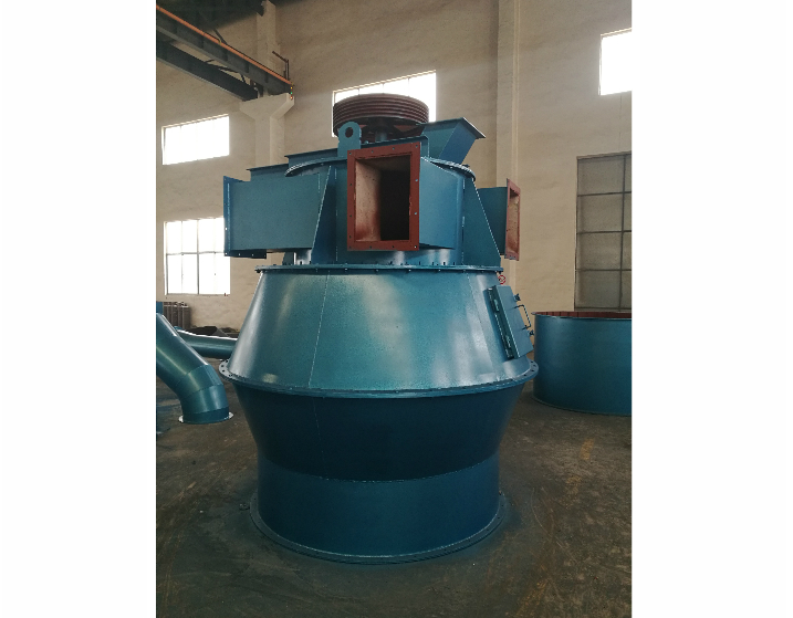 1、出磨物料由选粉机上部料斗进入选粉机内壳,落到与转子成一体的组合式螺旋桨散料盘上,在散料盘的高速旋转作用下,物料一方面受到惯性离心力作用向四周撤出,同时螺旋桨散料盘叶片产生的上升气流作用向上扬起,在散料盘螺旋桨叶片上形成物料沸腾。物料中较细的颗粒向上飘起,呈悬浮分散状态,而较粗或较重的物料被散料盘叶片分散沿筒壁落下,完成第一次选粉。