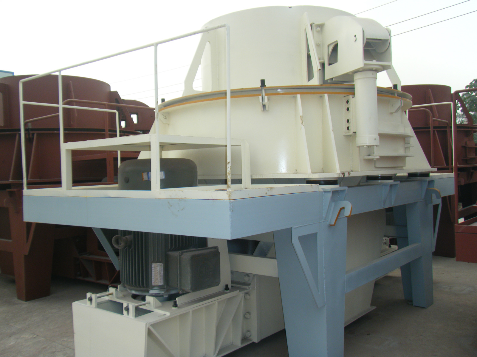 物料由进料斗进入制砂机,经分料器将物料分成两部分,一部分由分料器中间进入高速旋转的叶轮中,在叶轮内被迅速加速,其加速度可达数百倍的重力加速度,